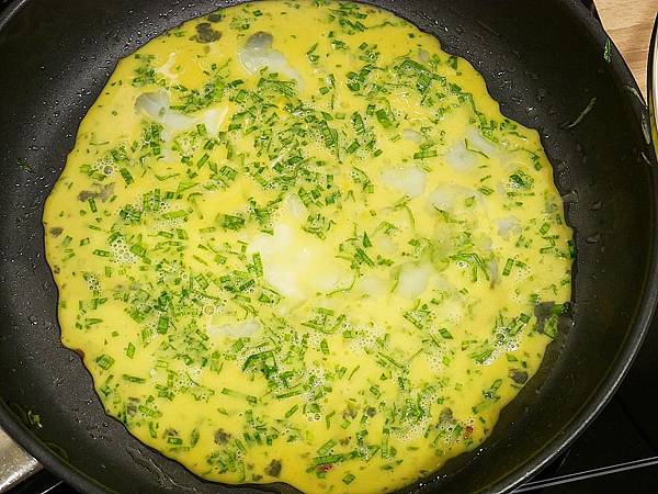 鴨賞蛋也超簡單,大蒜有上下段,比較綠的部分我把它切成小段,並打入兩顆蛋煎成蒜蛋