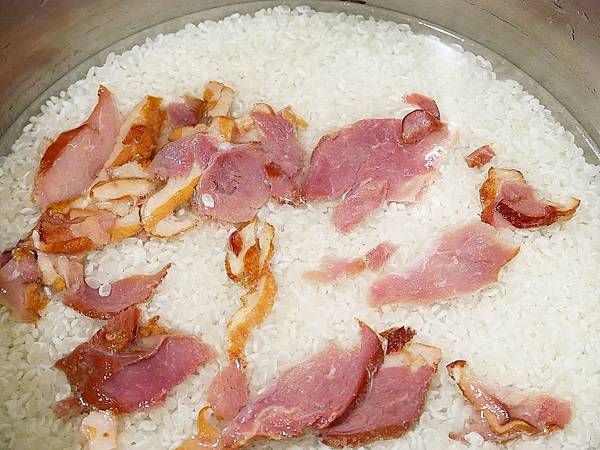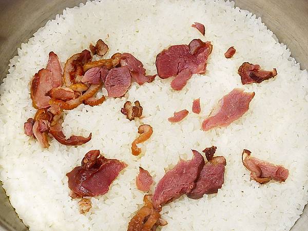 米洗好後放入適量的水,鋪上鴨賞後就直接放進電鍋裡悶煮15分鐘左右