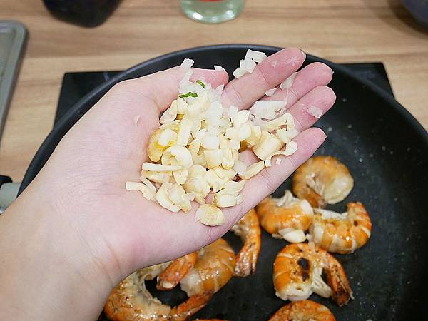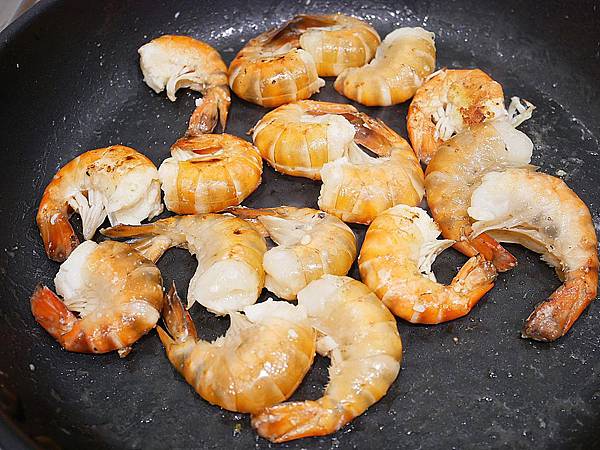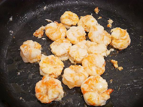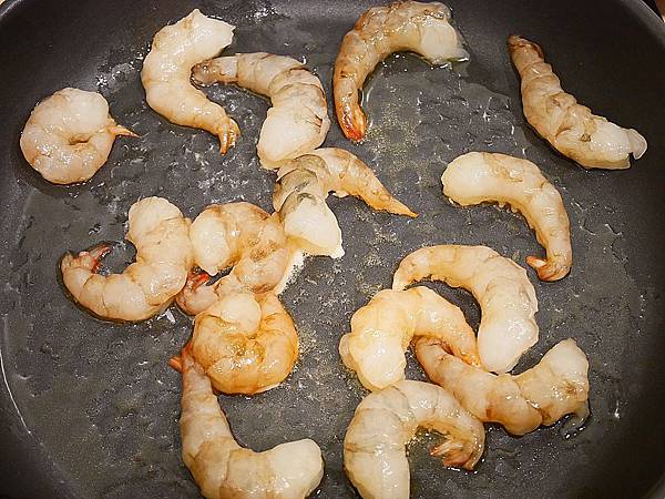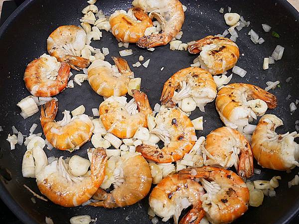 蝦子去殼開背後,也是立刻下鍋翻炒