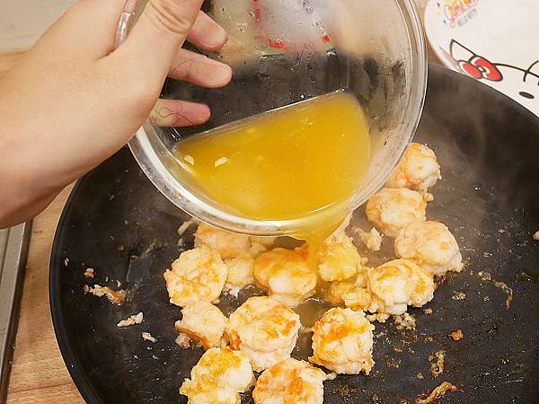 等蝦子都變色,就可以加入調好的金桔醬,蓋上鍋蓋悶煮約3分鐘