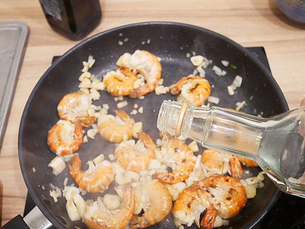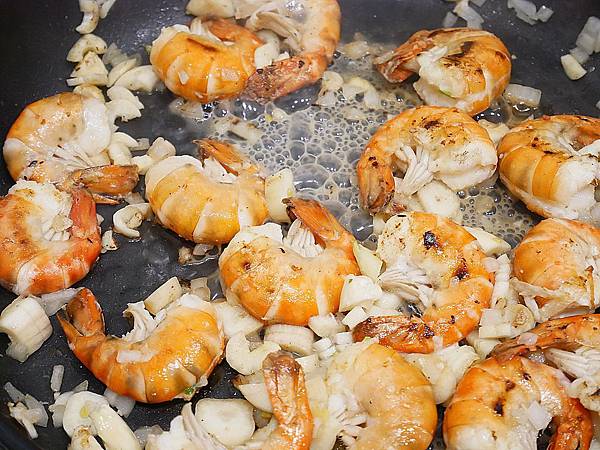 等洋蔥和蒜頭也稍微炒上色,加點料理米酒提香,盡量讓每一隻蝦都沾附到米酒香氣