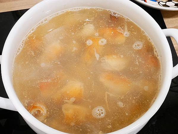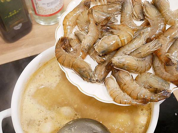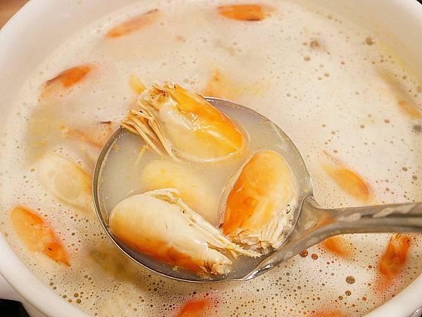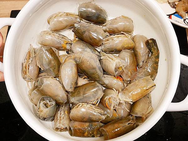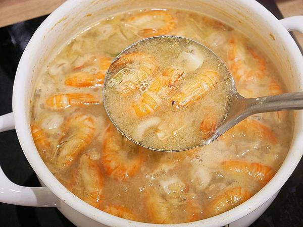 蝦子煮到後面會發現湯上頭漂浮很多泡泡,我個人是會撈掉,這樣湯看起來比較清澈