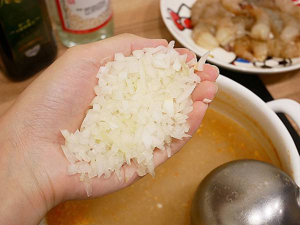 等蝦子轉紅就可以放入切好的洋蔥、蒜頭