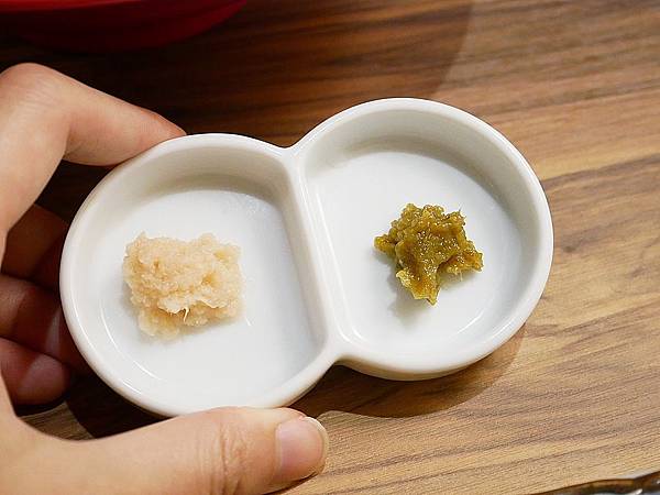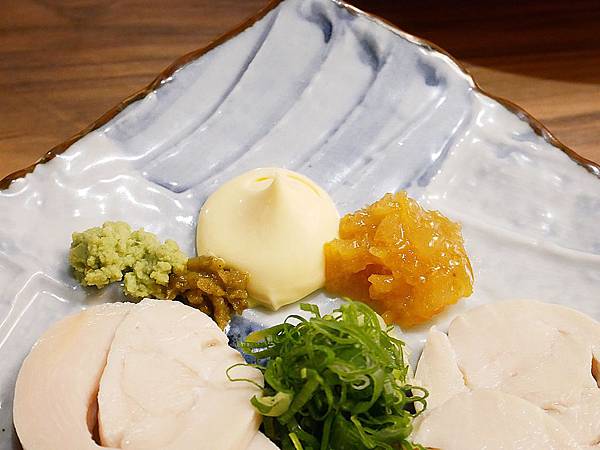 店家提供四種調味料,包含柚子醬、特製美奶滋、柚子胡椒和芥茉
