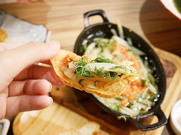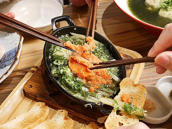 搭配上頭的蔥花以及鹹香明太子做提味,鋪在薄脆麵包上面真的超涮嘴