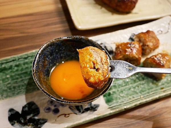 店員建議我們可以把雞肉丸子切成小塊沾蛋黃享用