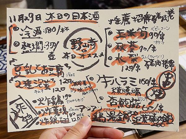 串燒野崎的菜單一段時間就會更換,而且每天都會有一張每日特色手寫菜單
