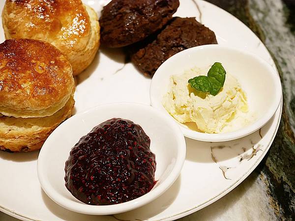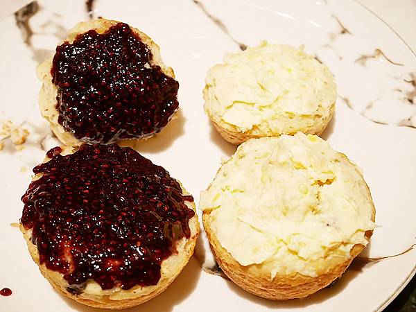 旁邊共有兩碟不同口味的抹醬,好吃到抹滿整顆司康才入口,一點都捨不得浪費