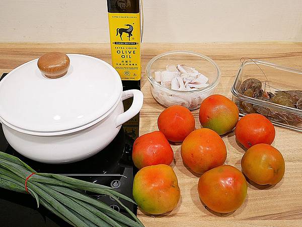 番茄海鮮湯要準備橄欖油、大顆的牛番茄數顆、蝦子、中卷或是其他自己喜歡的海鮮食材