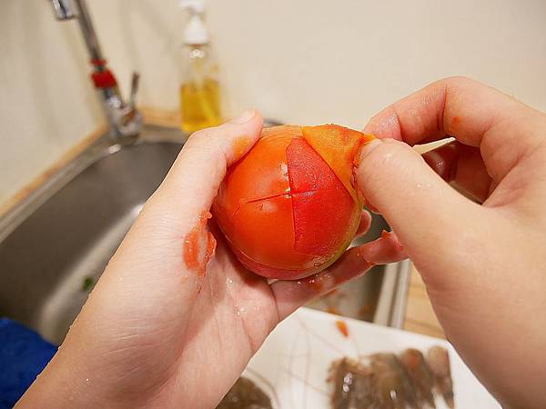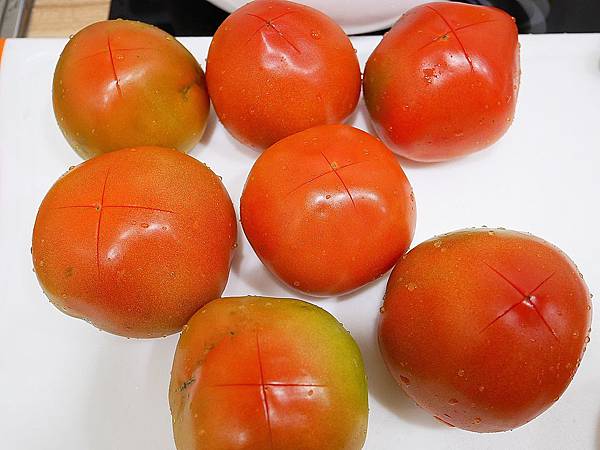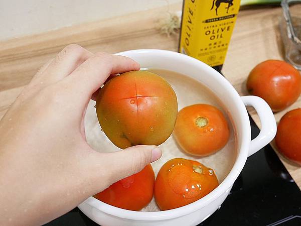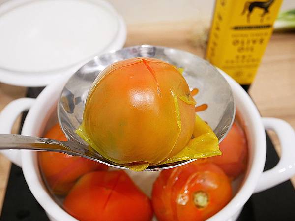 番茄洗乾淨之後在上頭劃十字,水滾後入鍋燙一下就可以撈起來撥掉番茄皮