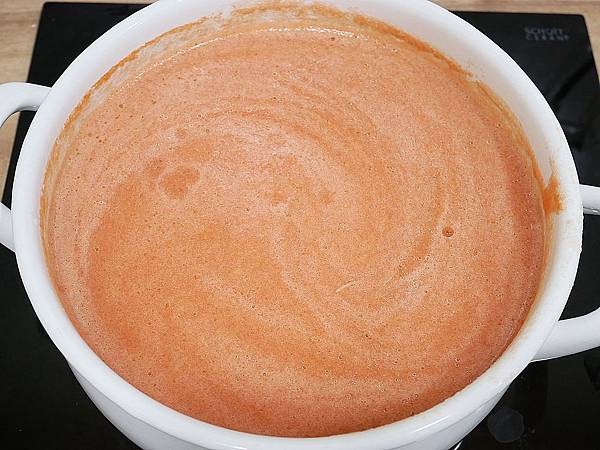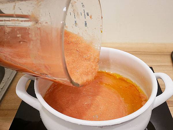 加完橄欖油就可以把番茄泥倒入,加些許清水拌至喜歡的濃稠度就可以開火烹煮