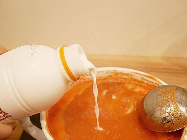 番茄湯滾了之後就可以加入所有海鮮食材,等海鮮煮熟可以依照個人口味加一些牛奶