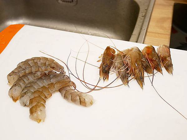 為了讓湯頭可以鮮甜一點,將蝦頭擰下入鍋一起烹煮