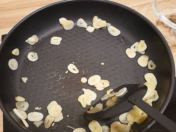 蒜頭去膜之後切成自己喜歡厚度的片狀,盡量不要太薄,以免翻炒時破碎