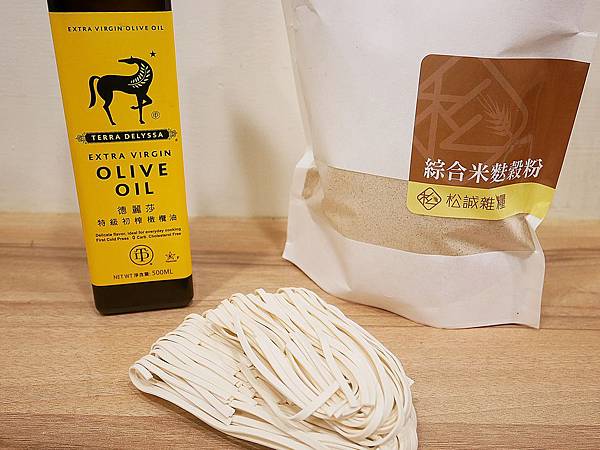 把麵燙軟之後瀝乾待用,額外取一個醬碟或碗倒入穀粉和橄欖油拌勻