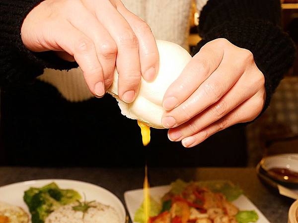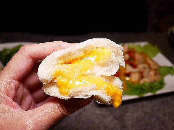 流沙包是當天的隱藏版,一剝開立刻流沙,奶皇餡不會太油,而且完全不甜膩,但濕潤度略微不足,流動性沒那麼高,包子的口感挺軟綿,熱熱吃口感還不錯