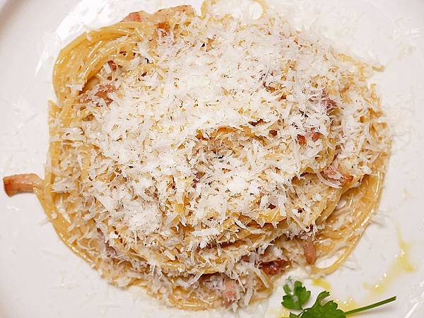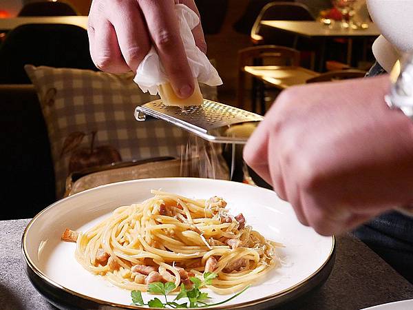 這款義大利麵的起司除了在料理時會加入之外,上桌後也會在桌邊現刨起司,視覺感大滿足。老闆起司給得超多,白花花的起司接連飄落下來,畫面超療癒。