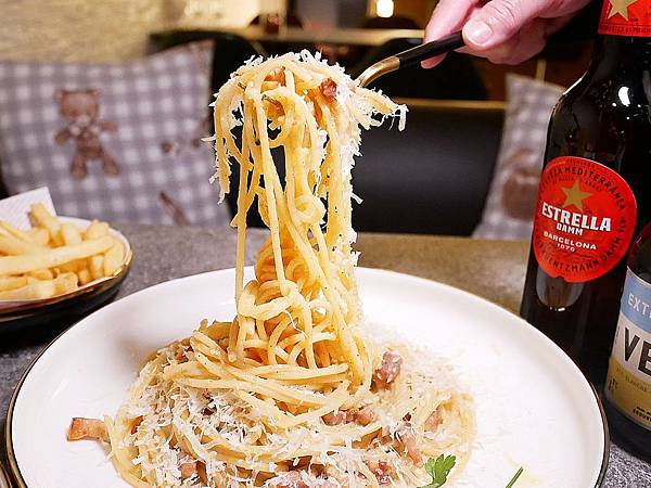 培根不是早餐店用的那種薄片,而是選用厚切煙燻培根一起拌炒,入口能吃到滿滿培根的香氣跟起司醬汁均勻融合,老闆介紹說還有加入蛋汁提味,風味相當多層次