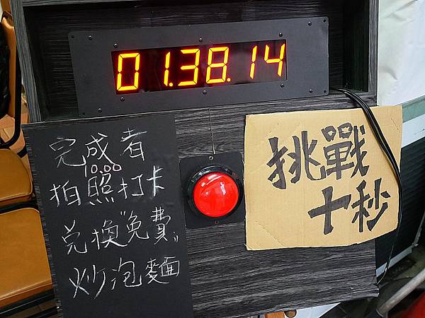 只要按下的瞬間,計時器顯示10.00 (10秒) 就能免費兌換一份炒泡麵