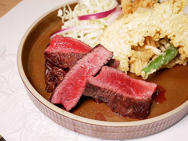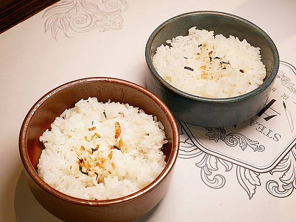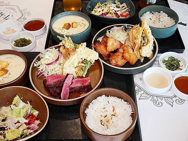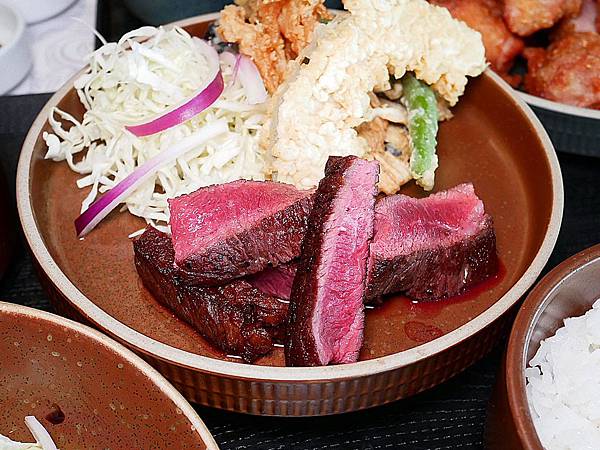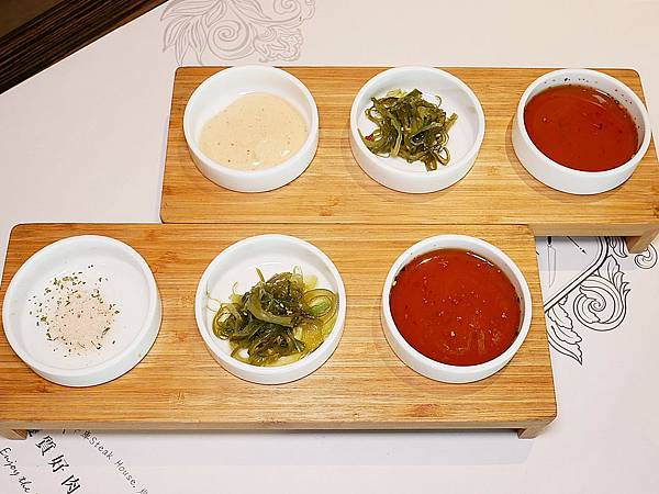 牛排會附上藻鹽,而唐揚雞則搭配胡麻醬