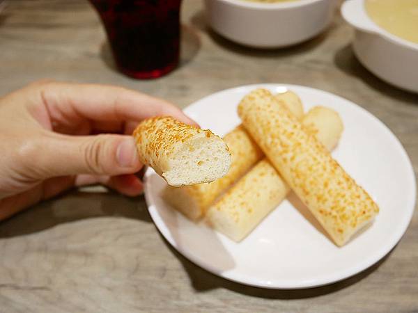 麵包吃起來口感相當紮實,咬下還挺有Q度,入口帶點帕瑪森起司的香氣,沾點濃湯口感更濕潤好吃
