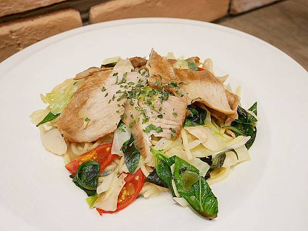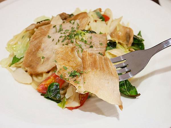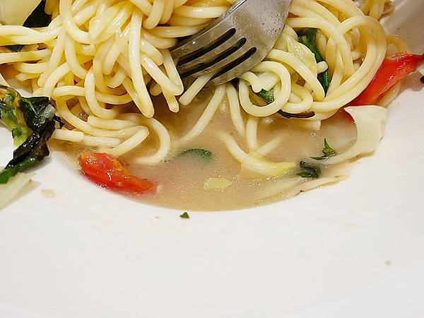 義大利麵搭配番茄、高麗菜、九層塔等蔬果,而且又是清炒,吃起來沒負擔