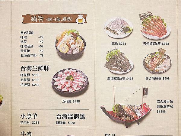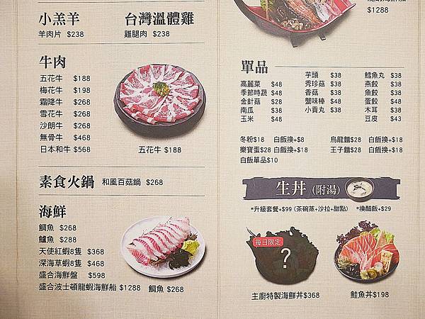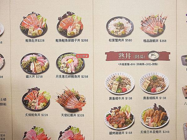 目前店家有推出$188精緻鍋物和$138熟丼、$198生丼的活動,而且都附湯