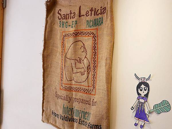 牆上掛著很多咖啡袋,其中一款放在櫃檯對面的咖啡袋是薩爾瓦多的一款咖啡豆