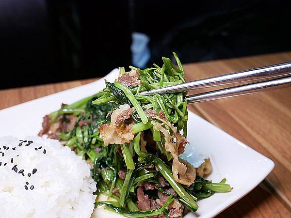 雪花牛肉的主食是雪花牛肉片跟空心菜一起拌炒,調味很剛好,吃起來不會太油太鹹相當涮嘴