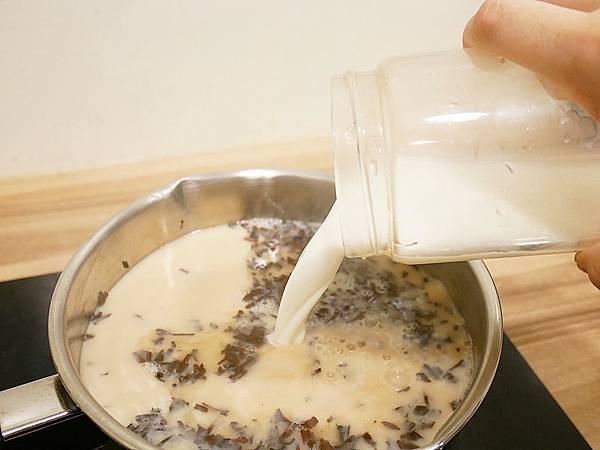 牛奶倒入要記得攪拌,而且也要把火稍微轉小,才不會產生泡泡影響口感