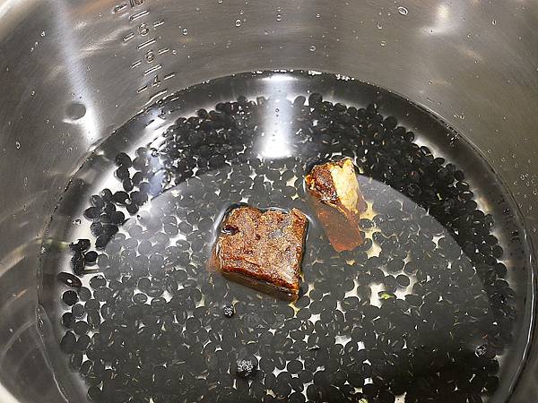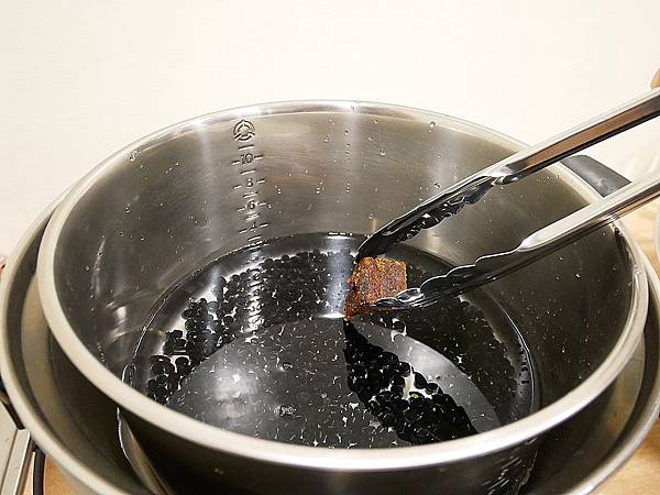 內外鍋都加好水之後就能放入薑母糖,兩人份的黑豆放入兩塊剛剛好