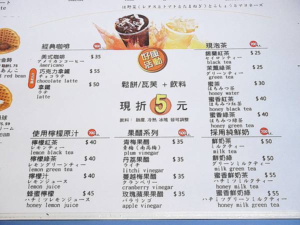不管點鹹味還是甜味的鬆餅/瓦芙,點飲料就折抵$5