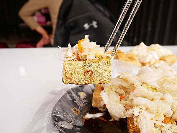 臭豆腐符合外酥內嫩這個標準,而且裡面是相當多汁,咬下會爆漿的那種,外層酥度大約8分左右,裡面的濕潤度我給9分,吃起來夠臭夠美味