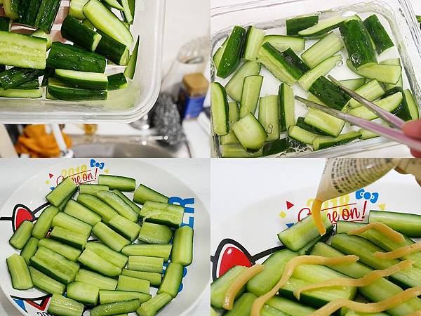 取出黃瓜後記得用開水洗兩遍,然後放在網子上或是夾取出來瀝乾