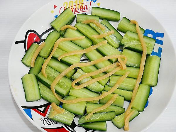 黃瓜洗淨後去掉頭尾,切成好入口的條狀,懶得切也可以用拍的,把黃瓜拍扁也是一種方法