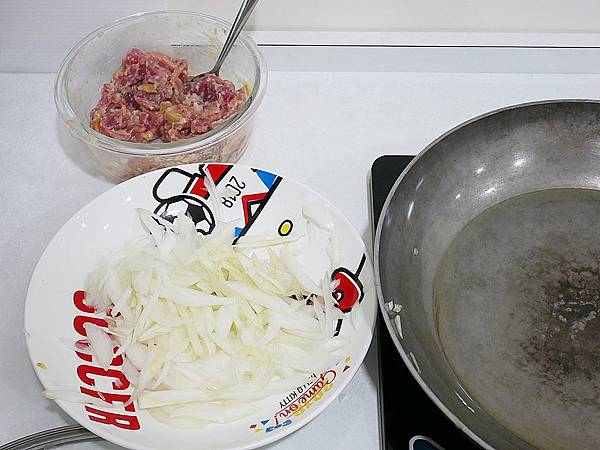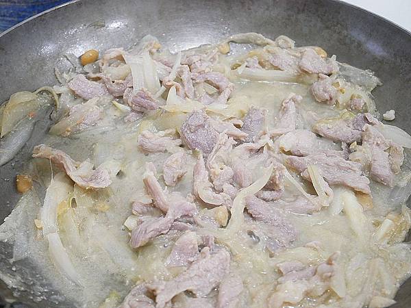 洋蔥先下鍋稍微炒軟,加入一些水就可以放肉片