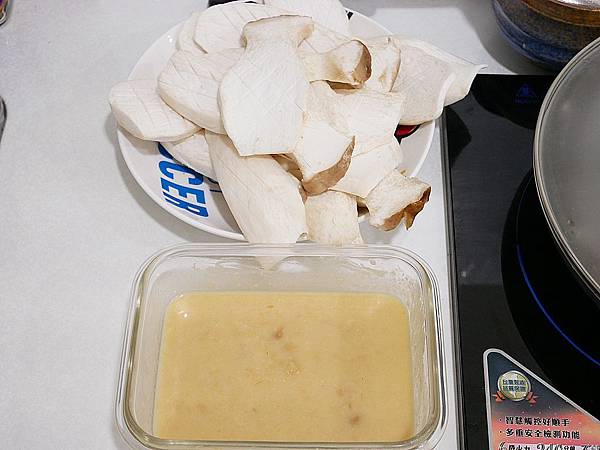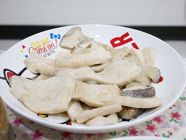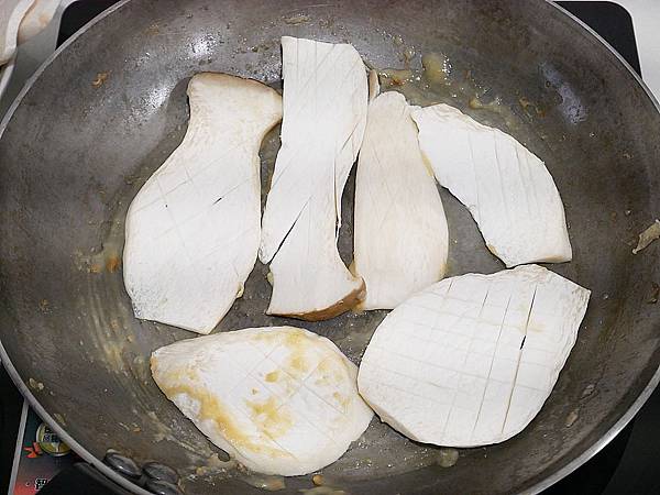 將杏鮑菇洗淨之後切成厚片狀,這樣口感會比較棒