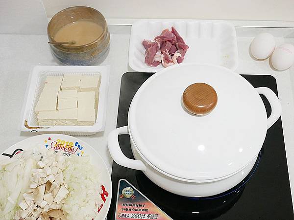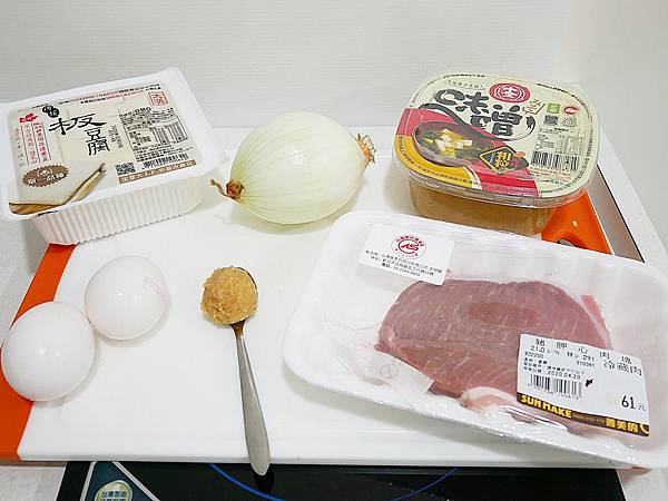 味噌、豆腐、洋蔥、豬肉、雞蛋、杏鮑菇