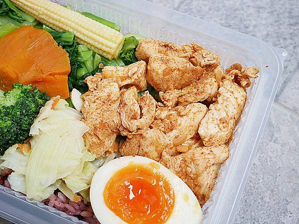 每份餐盒都附上半顆溏心蛋、四種蔬菜、地瓜、紫米飯,把餐盒填滿滿