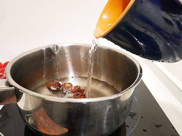 把甜話梅放到鍋中後,倒入能蓋過番茄的水量,可以先準備好容器,把番茄放進去測量