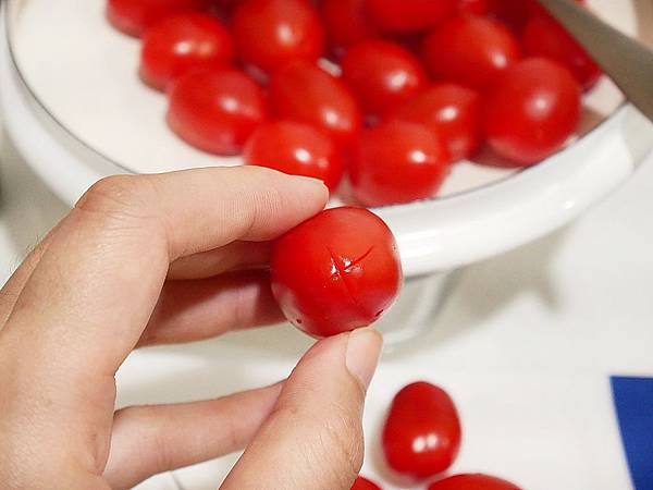 番茄洗乾淨之後將一側淺劃十字,記得不要劃太深