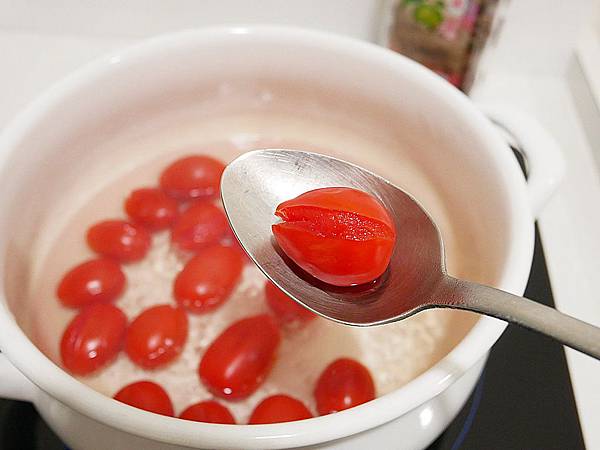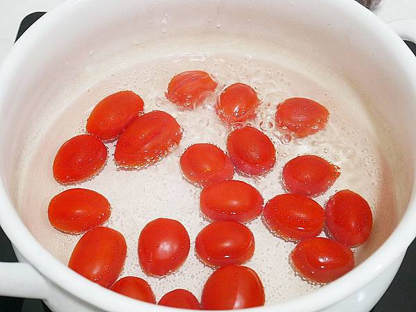番茄放入鍋中,並加水蓋過一半,開火煮滾到番茄皮翻起即可關火 (其實滾了就差不多)