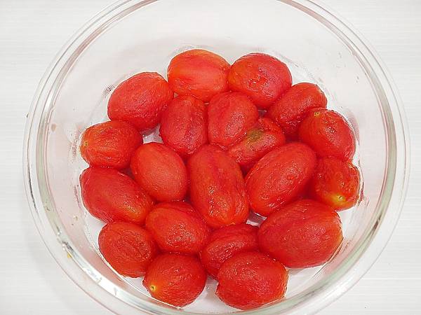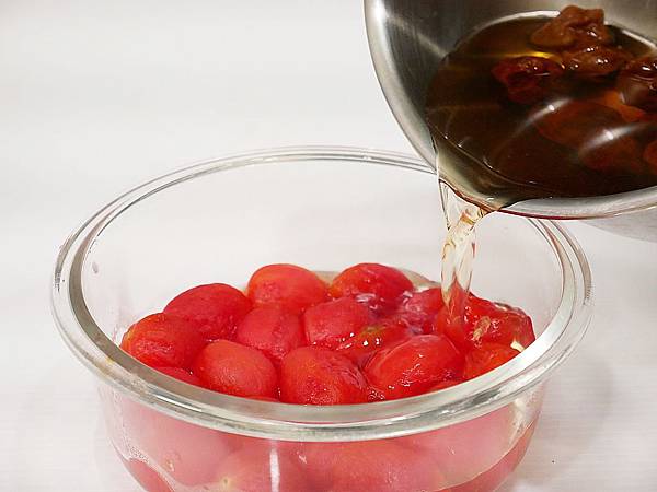 番茄都剝完皮就可以放入準備好的容器內,並加入放涼的甜話梅汁