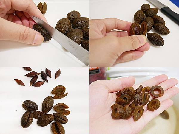 把烏梅李的肉切成塊狀,記得不要切太小塊,大約一顆李子切成5大塊的量