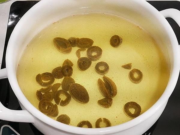 去籽後將橄欖切成小塊狀,就可以放入物鍋中