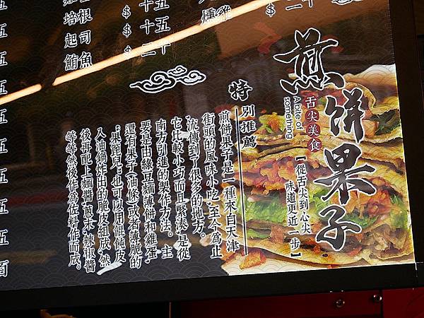 從看板上得知,原來煎餅果子是中國天津那邊超常見的小吃,但在台灣真的沒看過,用現煎的餅皮包覆滿滿食材、蔬菜、醬汁再放上一層薄脆,就成了美味煎餅果子
