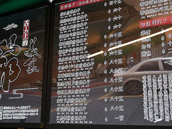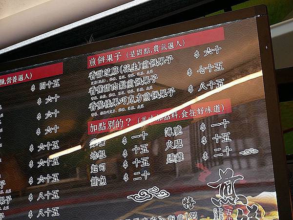 附上最新菜單連結 : 菜單點我 (2023.02更新)。煎餅果子的口味還不少,甜的鹹的都有,吃捲餅我還是習慣鹹味的,感覺會比較搭,喜歡什麼料多一點可以額外加,價格都有標示出來,薄脆就是咬下卡茲卡茲的那一塊,多加一片口感更加分,每一種口味除了主要食材不同之外,裡面的雞蛋、薄脆、香菜、蔥花、榨菜、生菜都是固定的,不喜歡什麼都可以提早跟老闆講