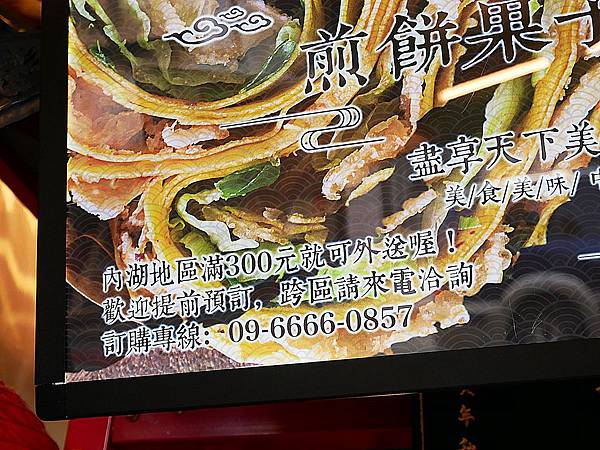 「老大爺煎餅果子」介於西湖站和港墘站之間,距離西湖站稍微近些,但出捷運站都要走一小段。這邊距離內湖科學園區超近,聽說有不少園區內的員工下午茶就訂他們家,有提供外送服務就是方便~