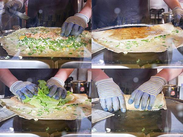 煎餅果子的製作過程超有趣,餅皮跟春捲或可麗餅一樣都是調好粉漿後在熱鍋上抹一層煎乾定型,接著加入其他食材、配料和醬汁,最後再鋪上滿滿生菜並捲起來,看那個size就知道吃起來有多飽!