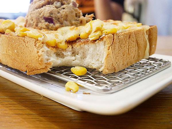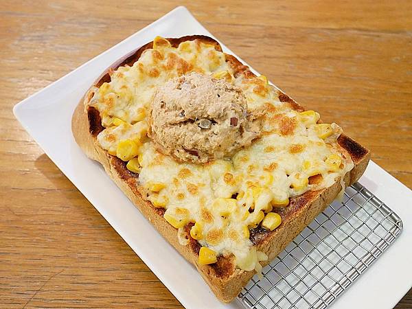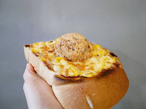 這款吐司鋪了一層焗烤玉米,最上頭再挖一球鮪魚沙拉擺上去,看起來很吸睛